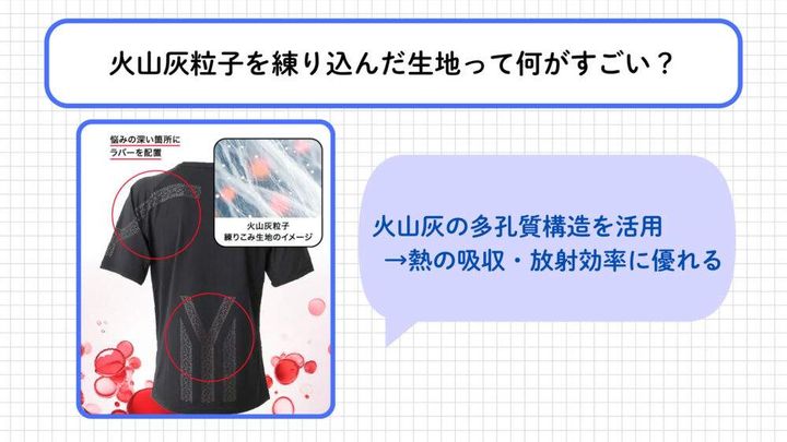 一般的に火山灰は多孔質構造を持つため、遠赤外線を輻射しやすい素材として採用されています。