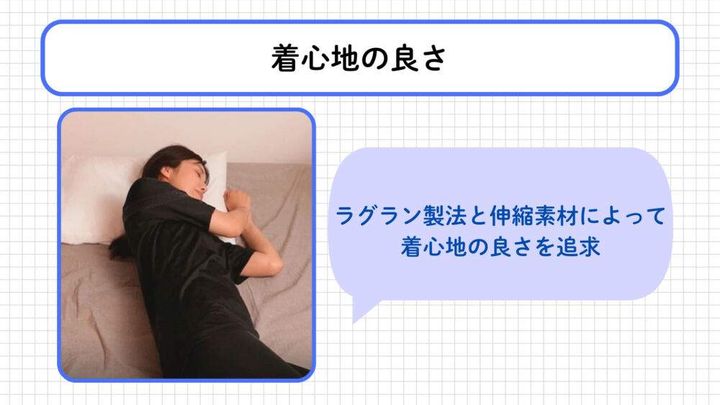締め付けの少ない伸縮素材とラグラン製法による動きやすさで、寝返りを打っても快適に過ごせるのがポイントです。