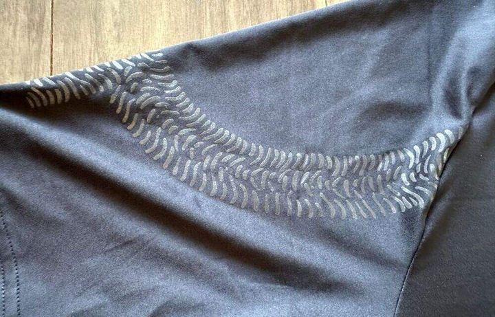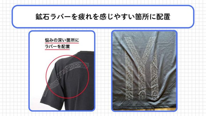 東條部長によると、生地自体に「火山灰粒子」を練り込んでいるだけでなく、疲れを感じやすい部位に配置されたラバープリントには「ブラックシリカ」や「トルマリン」が使用されているとのこと。