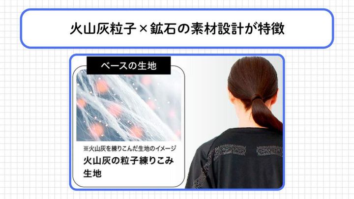 多くの競合ブランドがセラミックスや鉱石などを使用する中、火山灰の粒子を生地に練り込んだ素材設計が特徴といえます。