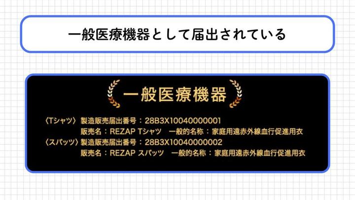 REZAPは、薬機法に基づく一般医療機器(家庭用遠赤外線血行促進用衣)として届出が完了しています。