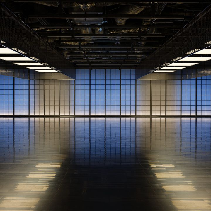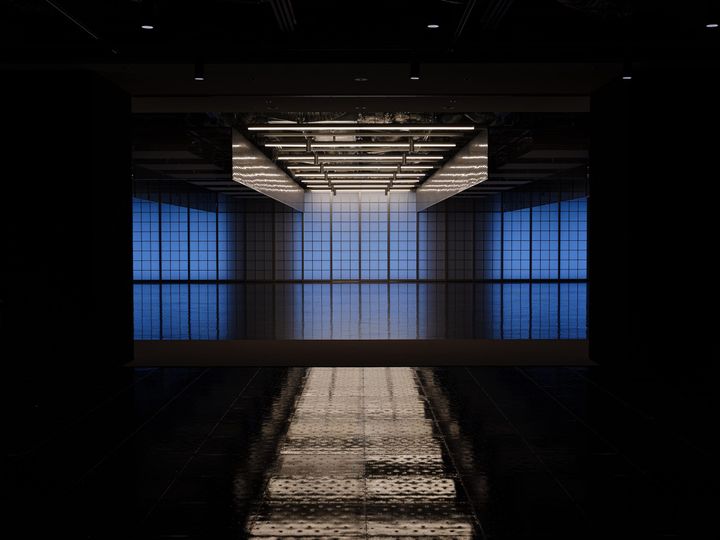 <写真>「余白1」では、中央に設置された膜張りの照明が均一で柔らかな光を放ち、床には瀬戸内海の水面のように、きらきらと揺らぐ表情を生み出している。