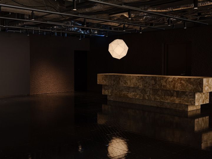 「余白2」は、いわば夜の海。こちらの床には、OAフロア(コンクリート床の上に専用パネルを敷き詰め、床下に配線空間を設けるシステム)に黒の塗料を塗布した。これにより、床面に瀬戸内の穏やかな海のような揺めきが現れる。オリジナルの照明の下に設置されたカウンターには、石膏系の素材であるジェスモナイトや鉄粉を採用。その表面に瀬戸内海から取り寄せた海水を塗り込み、鉄分を自然に酸化させる仕上げを施した。