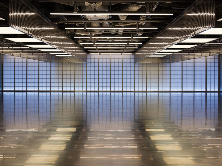 「TATOU TSUNEISHI」の特徴のひとつが、オフィスの中心に2つの「余白」を設けていること。これらの空間はトークショーや飲食イベントなどに使われ、用途に応じて柔軟に姿を変える。昼の海を想起させる「余白1」には、「東京に瀬戸内海をつくる」ことをイメージし、ステンレスパネルを床に貼った。窓部にはめ込まれた障子の格子は、この床材と呼応するよう銀色に塗装。和の趣を宿しながらも、どこか工業的な表情を帯びている。