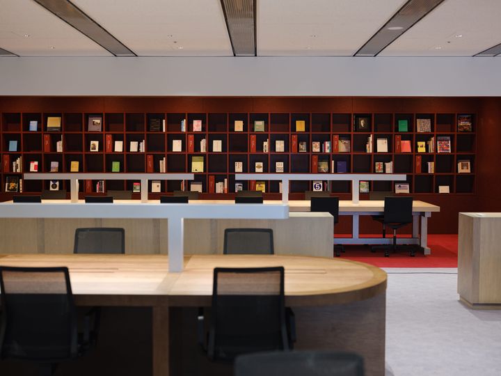 執務スペースの奥に設けられたライブラリーには、ブックディレクターの幅允孝が選書した15のジャンルの書籍を配架。選書内容はもちろん、並べ方にも工夫を凝らし、関連分野ごとに有機的なつながりを感じられる構成とした。