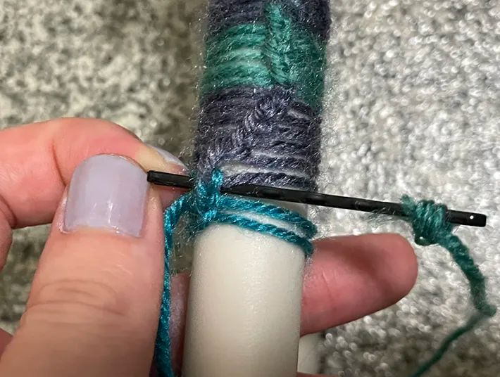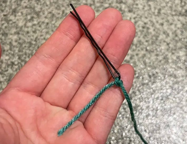 しっかりと締めたら、『右回りで持ち手の下に毛糸を通す』『一つ前の結び目の下からヘアピンをくぐらせる』という作業を繰り返していきます。