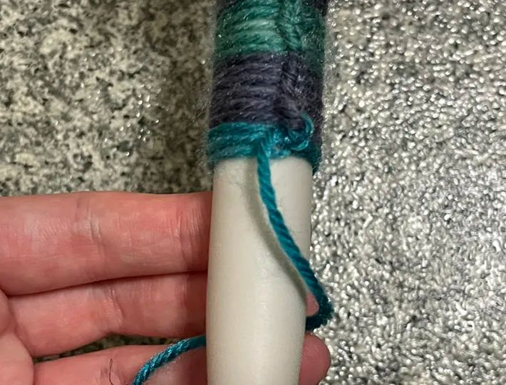 ただ、毛糸は持ち手の上を滑りやすいので、きつく締めるほか、両面テープを先に持ち手に貼っておくとより確実に固定できそうです。
