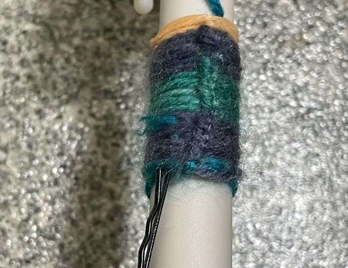輪ゴムも外し、固定していた毛糸も、ヘアピンを使って巻きつけた毛糸の下に差し込んでおきます。