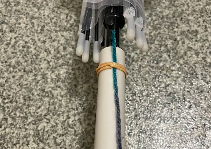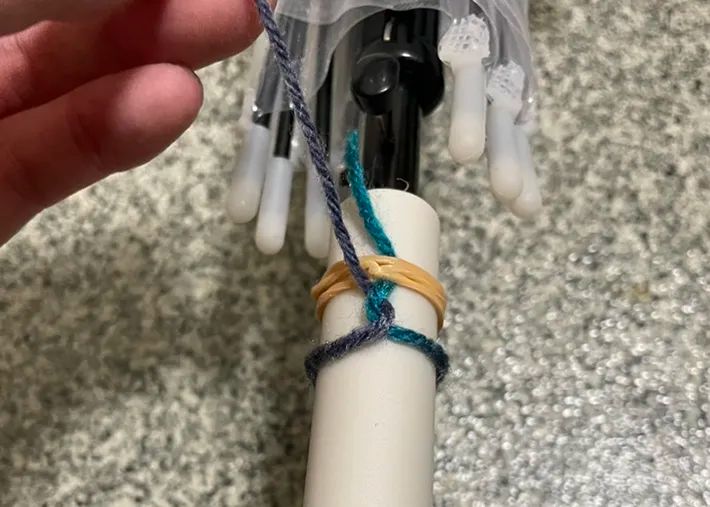 まず、毛糸の端の1つを、輪ゴムを使って傘の持ち手に固定します。