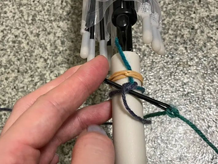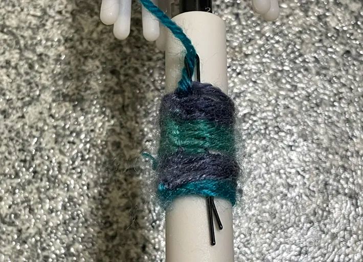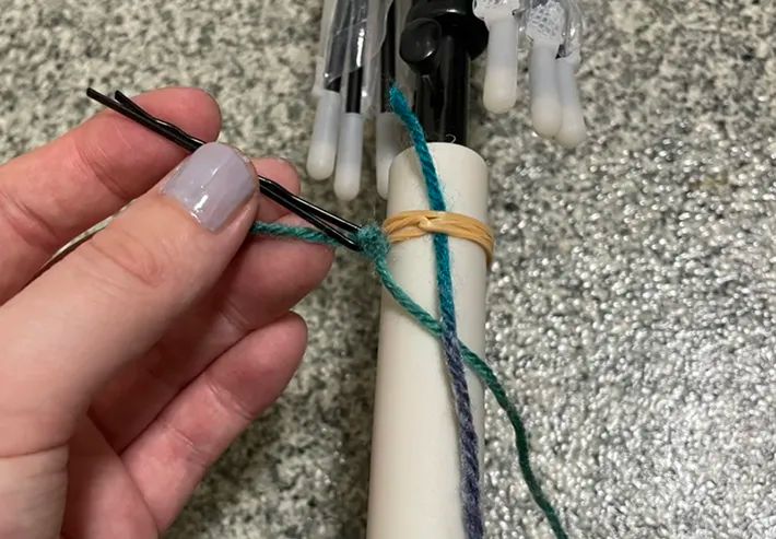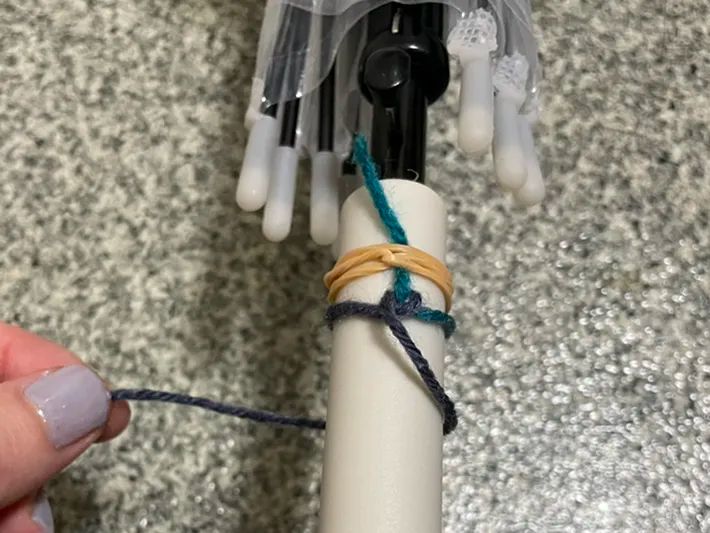 先に輪ゴムを巻きつけてから、その下に毛糸を差し込みましょう。