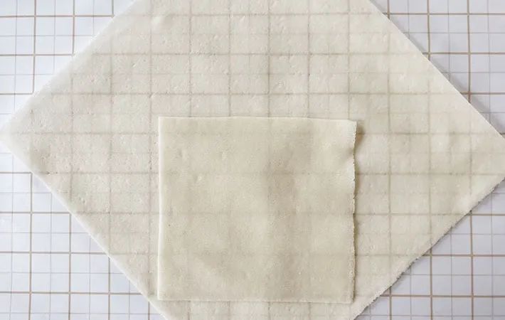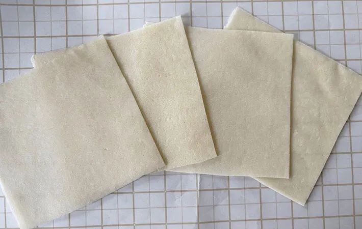 具が冷えたら、まな板やシートなどに春巻きの皮を1枚置きます。