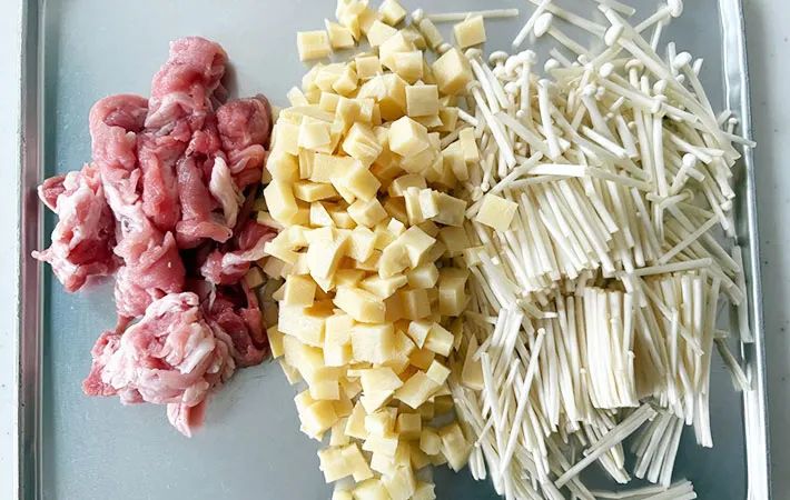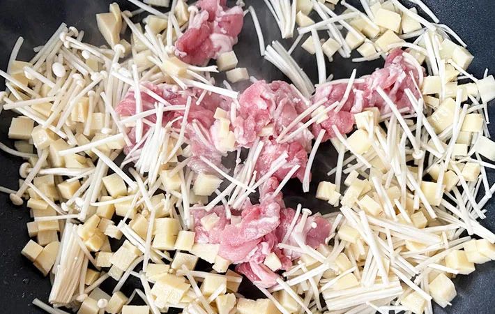 サラダ油を熱したフライパンに、タケノコ、豚こま切れ肉、エノキを入れしっかりと火を通してください。