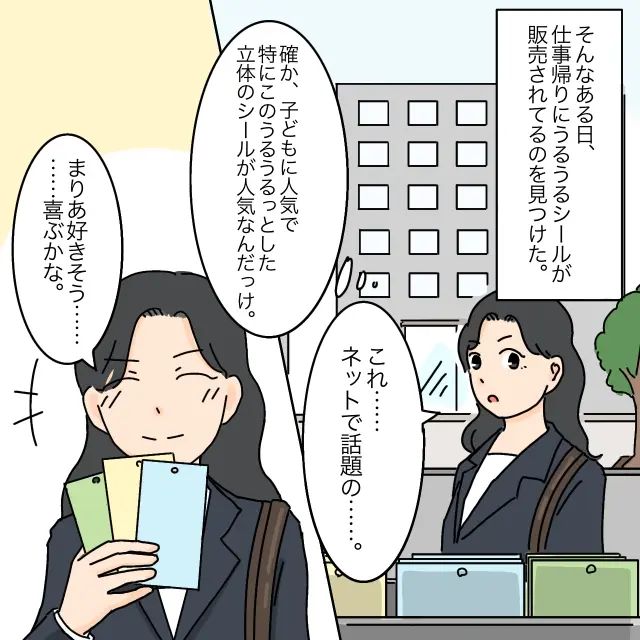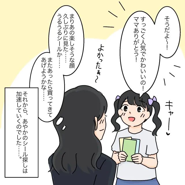 「そうだよ~。すっごく人気でかわいいの!ママありがとう!」まりあちゃんに笑顔でそう言われ、「よかったぁ~。まりあの楽しそうな顔久しぶりに見た・・うるうるシールか・・またあったら買ってきてあげようかな・・」心の中でそう呟くあやかさん、その後、あやかさんのシール探しは加速していくことになりました。
