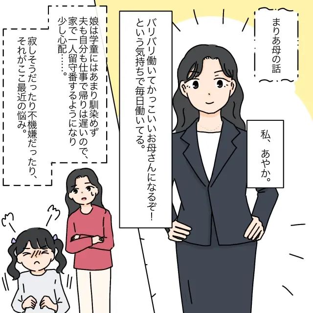 あやかさんは、「バリバリ働いて、かっこいいお母さんになるぞ!」そう思いながら毎日働いていました。まりあちゃんが学童に馴染めなかったこともあり、夫婦揃って仕事で帰りが遅いことから一人で留守番することになり心配していました。寂しそうだったり不機嫌だったりするまりあちゃんのことが最近の悩みでした。