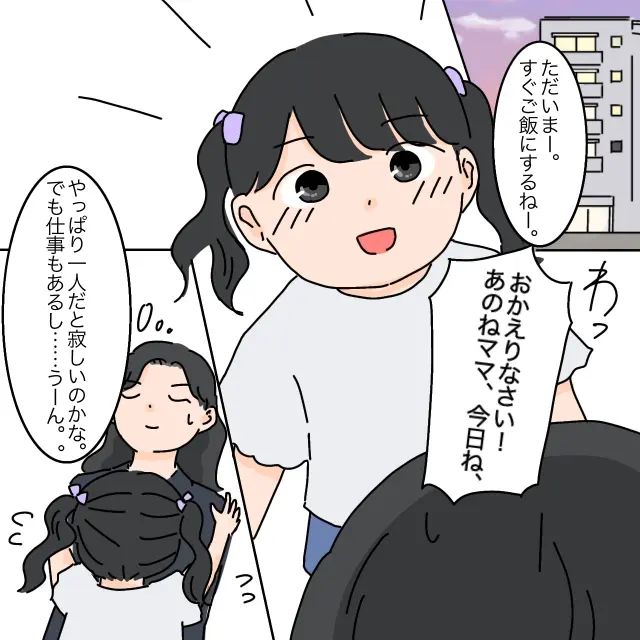 そして帰宅。「ただいまー。すぐご飯にするねー」とまりあちゃんに声をかけると、「おかえりなさい!あのねママ、今日ね」とすかさずしゃべりだすまりあちゃんに驚いたあやかさんは、「やっぱり一人だと寂しいのかな。でも仕事もあるし・・うーん」と心の中で呟きました。