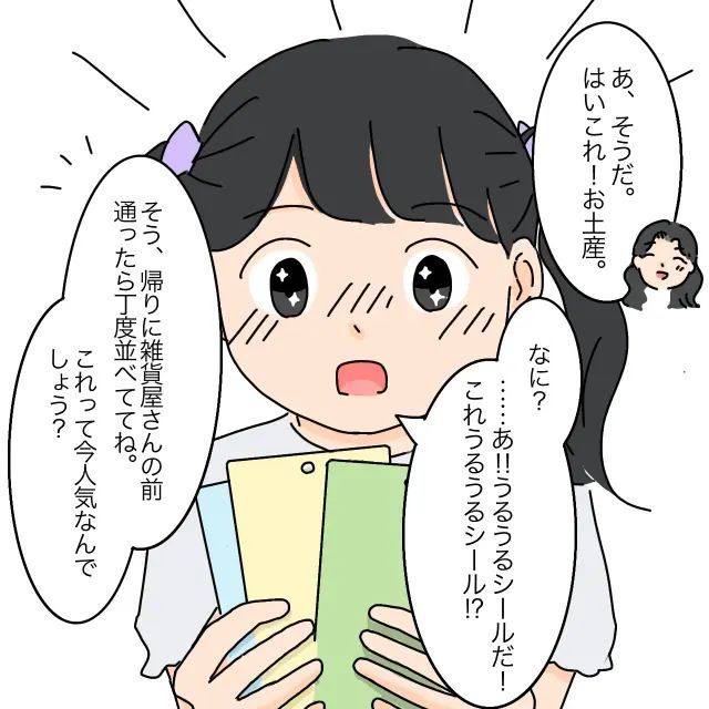 その後、「あ、そうだ。はいこれ!お土産」とさっき買ったシールを手渡すと、「なに?・・あ!!うるうるシールだ!これうるうるシール!?」とまりあちゃんは大興奮!「そう、帰りに雑貨屋さんの前通ったらちょうど並べててね。これって今人気なんでしょう?」あやかさんがそう言うと、