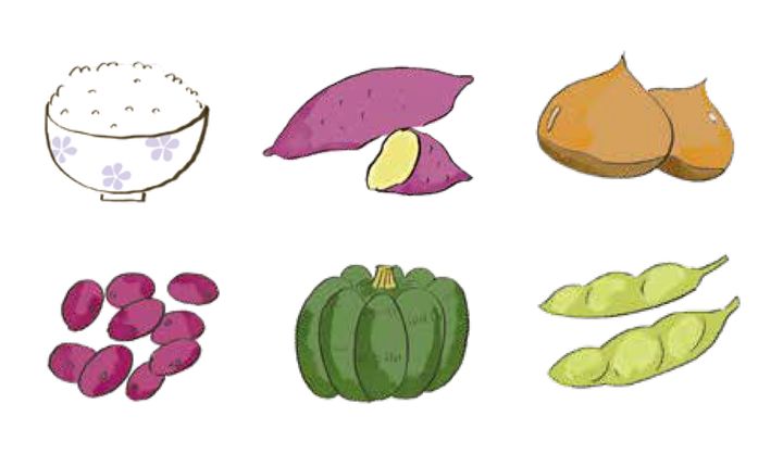 お米、大麦、さつまいも、じゃがいも、里芋、山芋、栗、かぼちゃ、黒豆、大豆、納豆、アボカド など