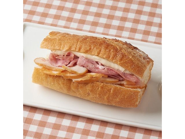 石窯で焼いたパリジャンに、スモークチキン、ソフトサラミ、レタス、シーザーマヨソース、クリームチーズなどを挟んだ、食べごたえのあるサンドです。 関東・東海・関西で販売