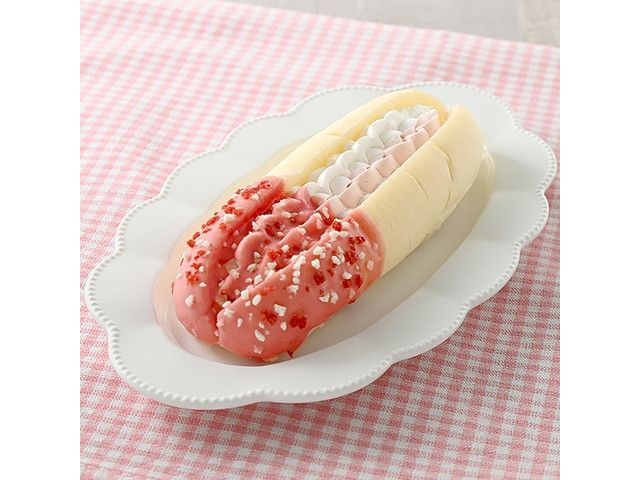 ふんわりとしたロールパンにいちごとミルクのホイップを絞り、2色のクランチをトッピングしました。