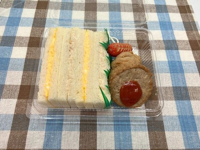 たまごサラダとツナポテトサラダのサンドイッチに、唐揚げ・赤ウインナー・ハンバーグをトッピングしたセットです。 宮崎・鹿児島で販売