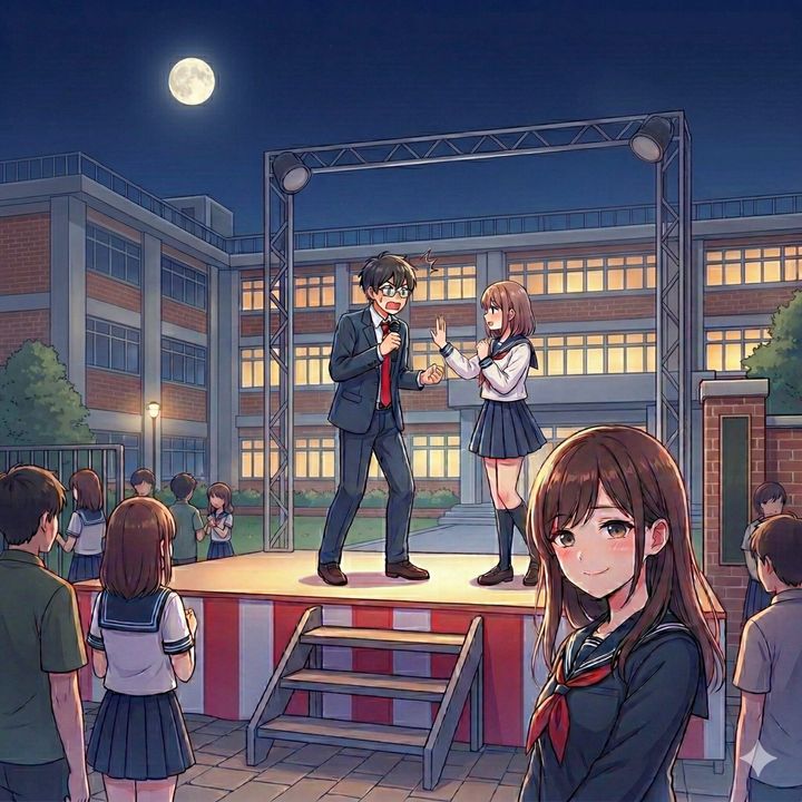 マイクを通した声が夜のグラウンドに響き渡り、全校生徒が固唾を飲んで彼女の口元に注目しました。手渡されたマイクを握り、彼女はひどく気まずそうに呟きました。