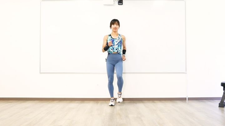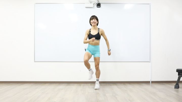 小さくジャンプしながら、リズム良く進めていましょう。腕は大きく振ってください。
