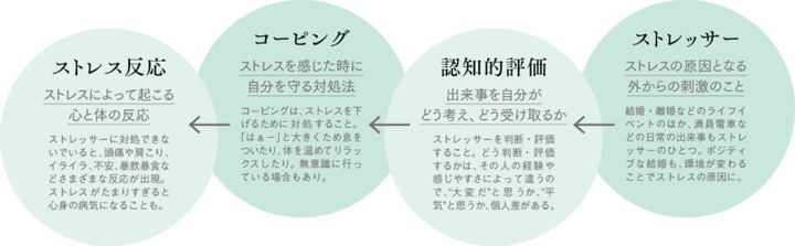 ストレッサーがかかっても、誰でもすぐにストレス反応が出るわけではありません。同じ出来事でも、それをストレスに感じるかは人によって異なります。その差は、ストレスの受け取り方(認知的評価)と対処の仕方(コーピング)にあります。ストレスとどう向き合うか次第で負担が軽減できるので、ストレッサーに気づき、自分に合った対処法を見つけて生活の中に取り入れてみましょう。