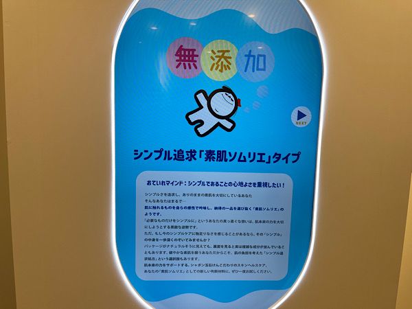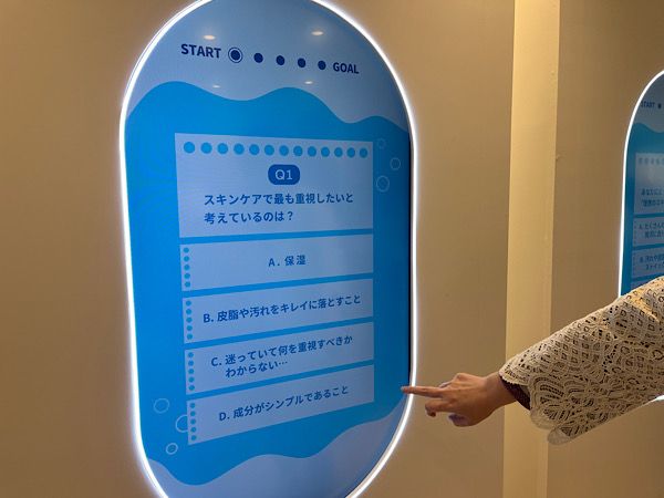 こちらのポップアップショップでは、いろいろな体験ができます。まずは日々のスキンケアへの向き合い方について、質問に答えていくと自分自身の「お手入れマインド」がチェックできるデジタル肌診断コーナーへ。