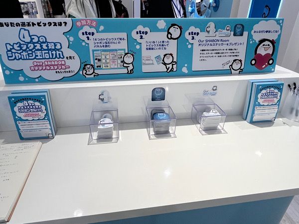 このイベント限定のカプセルトイやオリジナルグッズ、Our SHABONシリーズを実際に手に取って購入することができるコーナーも。また、シャボン玉石けんの歴史やこだわりなどが学べるパネルコーナーでは、一番響いたトピックスに投票することでオリジナルステッカーが貰えます。