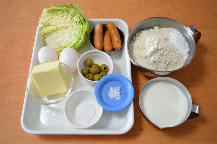 中にはキャベツ、ソーセージ、オリーブがぎっしり。キャベツのやさしい風味とともに、どこを食べてもソーセージの旨味とオリーブの塩味が味わえます。