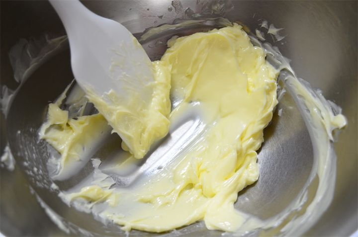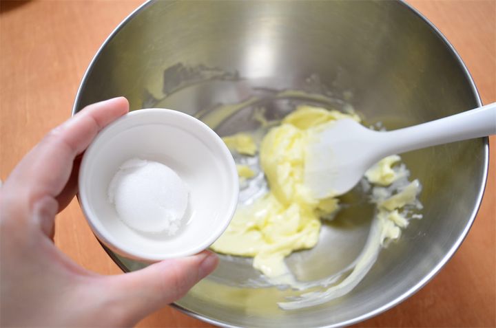 3. バターをクリーム状に伸ばしたら、砂糖、塩を加えてよく混ぜる。