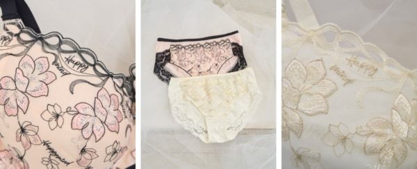 肌に馴染むピンク地にレースをのせたサックスと、ゴシックなムードもあるブラックの2色展開。