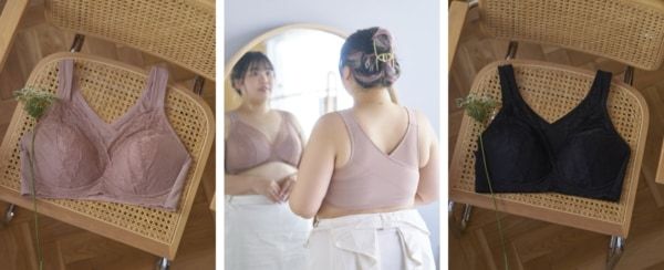 背中のクロスパネルが美しい姿勢に導く「猫背サポートブラ」は、既存のデザインで特に人気なカシュクールタイプからレース替えして新作を発売。定番かつ人気のブラックと、肌なじみが良く洋服に透けにくいピンクベージュを展開します。