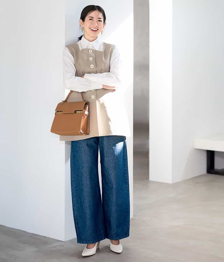 デニムパンツ¥39,600(デパリエ/デパリエ 伊勢丹新宿店)ジレ¥37,000(シーニュ)シャツ¥56,100(マディソンブルー)バッグ¥1,101,100(デルヴォー)パンプス¥137,500(ジャンヴィト ロッシ/ロンハーマン)片耳ピアス各¥32,890(ビジュードエム/ビジュードエム六本木ヒルズ)