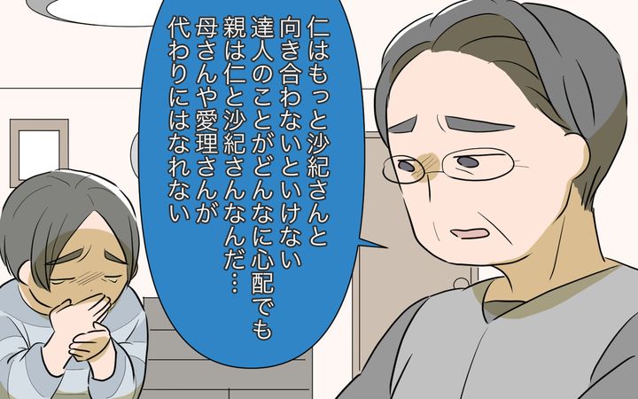 仁さんと離婚した沙紀さんは、一時実家に帰られたようですが、すぐにひとり暮らしを始めたそうです。カウンセリングにも通っているようで、だいぶ落ち着いてきたと仁さんから聞きました。達人くんとも定期的に面会しているとのことですが、仁さんがこの先沙紀さんとどう付き合っていくのかは私にはわかりません。