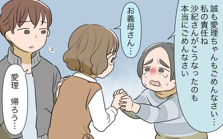 お義母さんはとても打ちひしがれていましたが、お義父さんが「母さんのことは大丈夫だから」と強く言ってくれたので、私たちも帰路につきました。自分自身の行動を振り返って、どこで私は間違ったのか、どうしたら沙紀さんに寄り添えたのか…。答えが出ない問題をずっと解き続けているようでした。そして…。