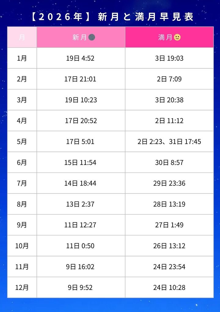 2026年の新月と満月のスケジュールは以下の通りです。