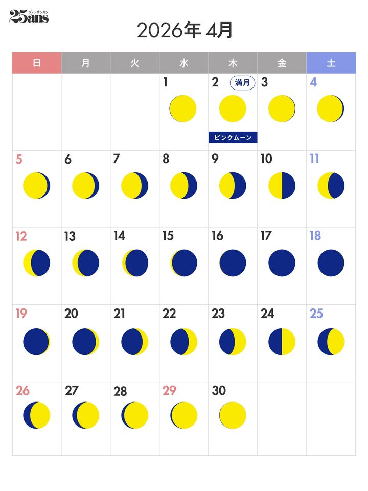 • 4月:新月 4月17日(金) 20:52 / 満月 4月2日(木) 11:12
