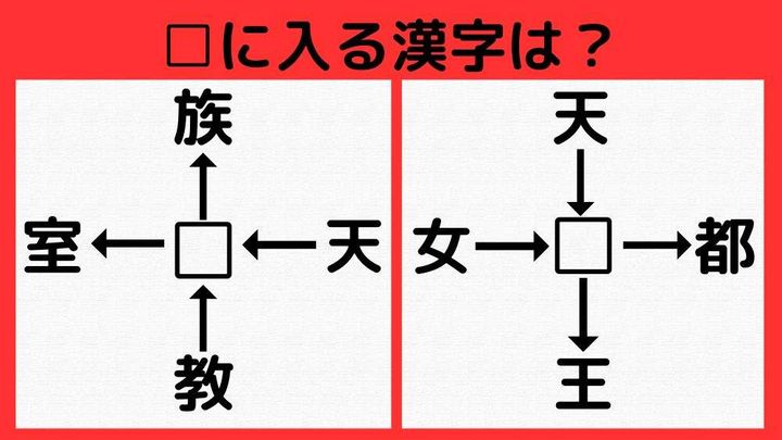 【漢字パズル】□に入る漢字はなんでしょうか? □族、天□、教□、□室・・・!?