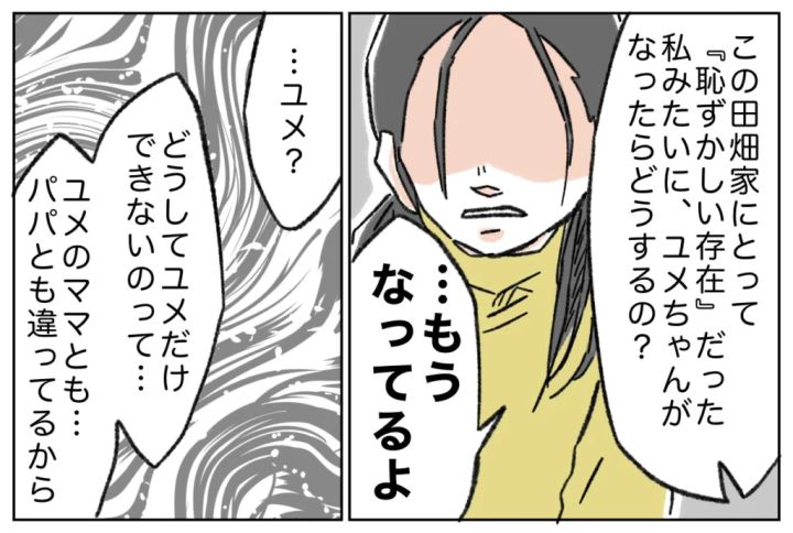 「この田村家にとって『恥ずかしい存在』だった私みたいに、ユメちゃんがなったらどうするの?」私がそう言うと、ユメちゃんが小さな声で「もうなってるよ」とつぶやきました。そして、今まで胸に溜め込んできた思いを吐き出すように、「どうしてユメだけできないのって、ユメのママともパパとも違ってるから・・・」と、震える声で続けます。