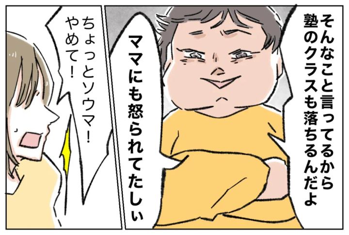 ソウマくんはユメちゃんを見下すような表情を浮かべて、「そんなこと言ってるから塾のクラスも落ちるんだよ、ママにも怒られてたしぃ」と心ない言葉を投げかけます。「ちょっとソウマ、やめなさい!」と姉が慌てて止めますが、ソウマくんは聞く耳を持たず、態度を改めようとはしません。