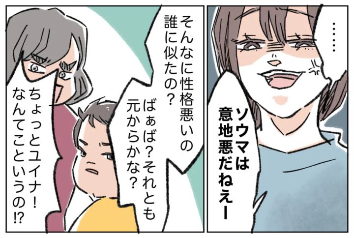 ユメちゃんを見下すようなソウマくんの態度に、私はとうとう我慢できなくなり、思わず「ソウマは意地悪だね~そんなに性格悪いの誰に似たの?ばぁば?それとも元からかな?」と、大人げない言葉を口にしてしまいました。「ちょっとユイナ、なんてこと言うの!?」と母に叱られましたが、一度火がついた私の怒りは、簡単には治まりませんでした。
