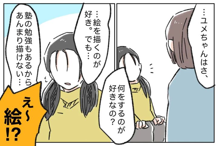 私はユメちゃんに「ユメちゃんはさ、何をするのが好きなの?」と優しく声をかけました。ユメちゃんは少し間を置くと「・・・絵を描くのが好き、でも塾の勉強もあるからあんまり描けない」と控えめに答えます。すると次の瞬間、そんなユメちゃんの言葉をかき消すように、ソウマくんが「え~絵!?」と声を上げました。