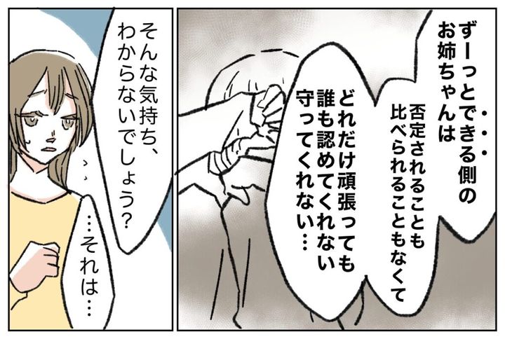 「ずーっとできる側のお姉ちゃんは、否定されることも比べられることもなくて・・・どれだけ頑張っても誰も認めてくれない、守ってくれない、そんな気持ちわからないでしょう?」そう伝えると、姉は「・・・それは」と言葉に詰まっていました。