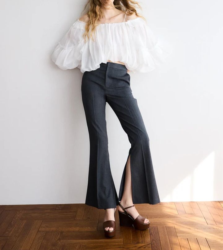 サイドスリットが印象的なフレアパンツ。試着すると即購入決定する方が多い、超美脚パンツです。正面から見ると、シンプルでキレイなスラックスなので、普通のパンツのようにコーディネートの幅が広い点がまず最高。フロントスリットと比較すると、靴の選択肢が狭まらないので断然はきやすいはず。しかもひざ下からのなめらかなフレアシルエットで、脚長効果は抜群。ヒップからのひざまでのラインは比較的タイトですが、ストレッチが効いているので、窮屈さはゼロ。むしろ程よいフィット感で、気持ちがいい! んです。ゆるいシルエットのパンツばかりだった方には最初はハードルが高いかもしれませんが、極楽の着用感で、見た目キレイなパンツってなかなかないので、1本あると活躍してくれるはず。