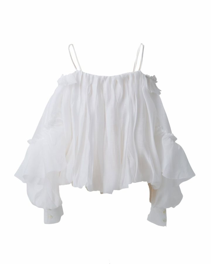 こちらはエアリーなバルーンフォルムが特徴のオフショルトップス。ハリのある生地を使用しているので、ふんわりと丸いシルエットをキレイに保ったまま着用でき、ボディラインを拾わない点も嬉しいですよね。素材も軽く風通しがいいので、真夏まで活躍してくれます。ブラックも大人なムードで素敵ですが、顔色をぐっと明るく見せてくれるホワイトがオトナミューズ的推しカラーです。写真のようにスラックスを合わせて、キレイ目にまとめればお食事会などにもぴったり、デイリーにはデニム合わせが鉄板です。