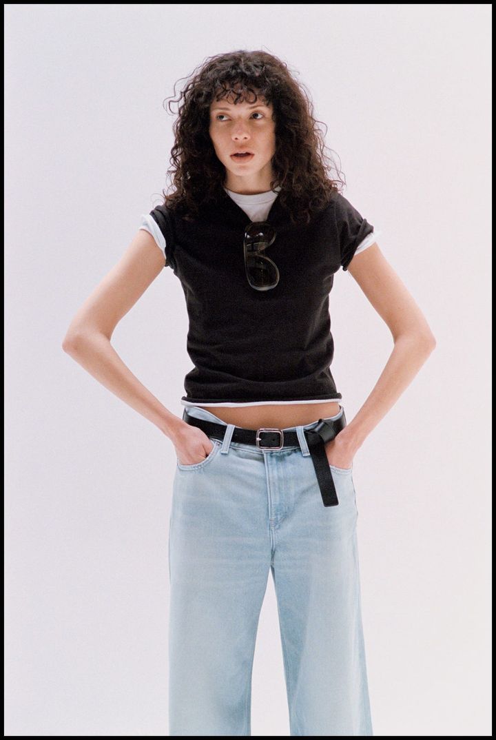 A. ベルトでウエストマークは大前提。タイトなチビTから肌をチラ見せし、作り込みすぎないヘルシーな色気を放って。Tシャツはサイズ違いをレイヤードして、奥行きあるバランスに仕上げるのが上級者。