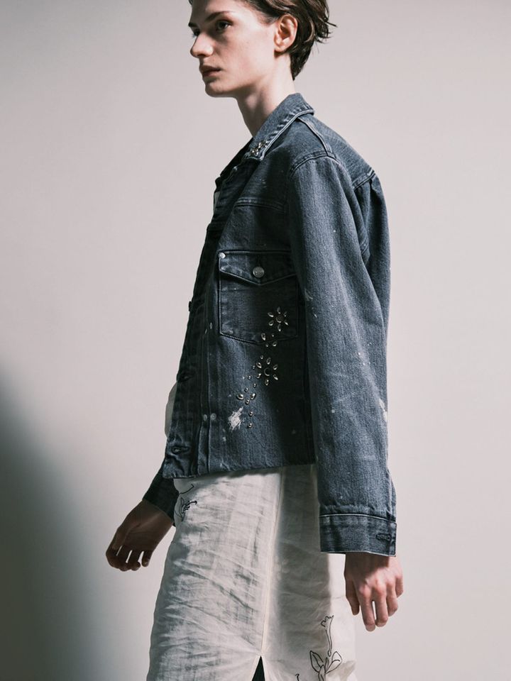 センスが光るリメイクデニムを主役に。端正なシャツを合わせつつ、ウエスト周りの変形シルエットを強調すべく、アンバランスな古着風トップスでウエストマーク。