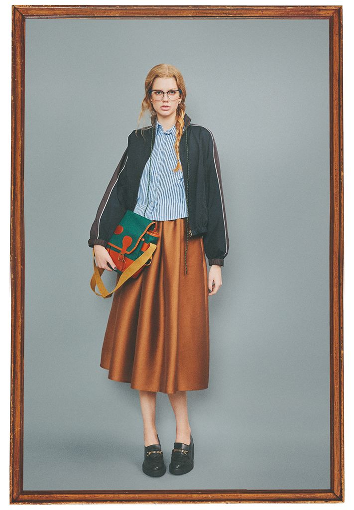 スポーティなブルゾンとレディなスカートを合わせた、鉄板のMIXスタイル。トラッドな小物を選び、きちんとした見た目からはみ出ないよう小粋なムードも帯びる見た目に。つなぎ役となるインナーは、無地よりカラーストライプのシャツでまじめと遊びを半分ずつ。