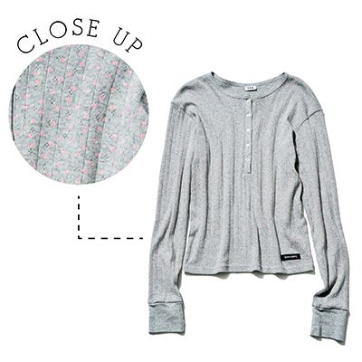 グレー×ピンク花柄ロングTシャツ/SEA(エスストア) ひかえめな極小サイズ&淡色。肌あたりのやさしい質感で、着心地・見心地ともにやわらかく。ヘンリーネック+えりぐりのラウンドステッチのコンビネーションでよりなつかしさのある雰囲気。